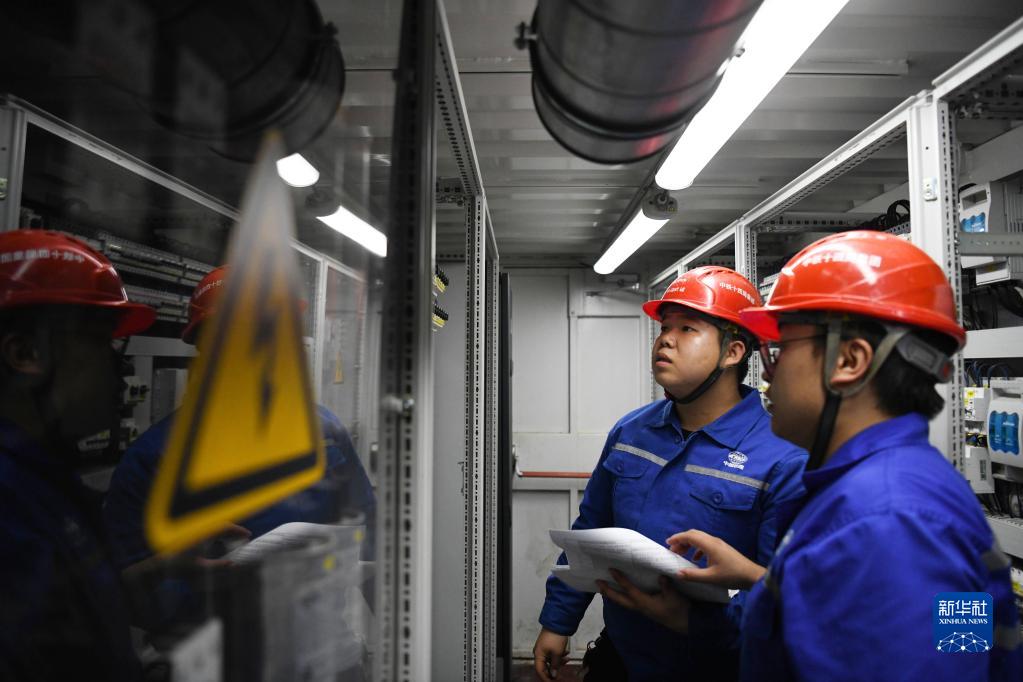 10月3日,在芜湖城南过江隧道施工现场,工作人员杜世俊(左)和同事在进行设备巡检。