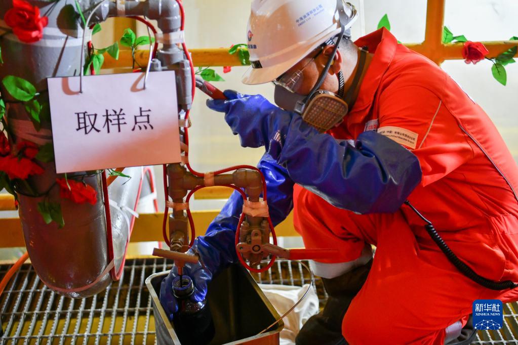 中海油工作人员在“海基一号”取样点接取原油(9月30日摄)。