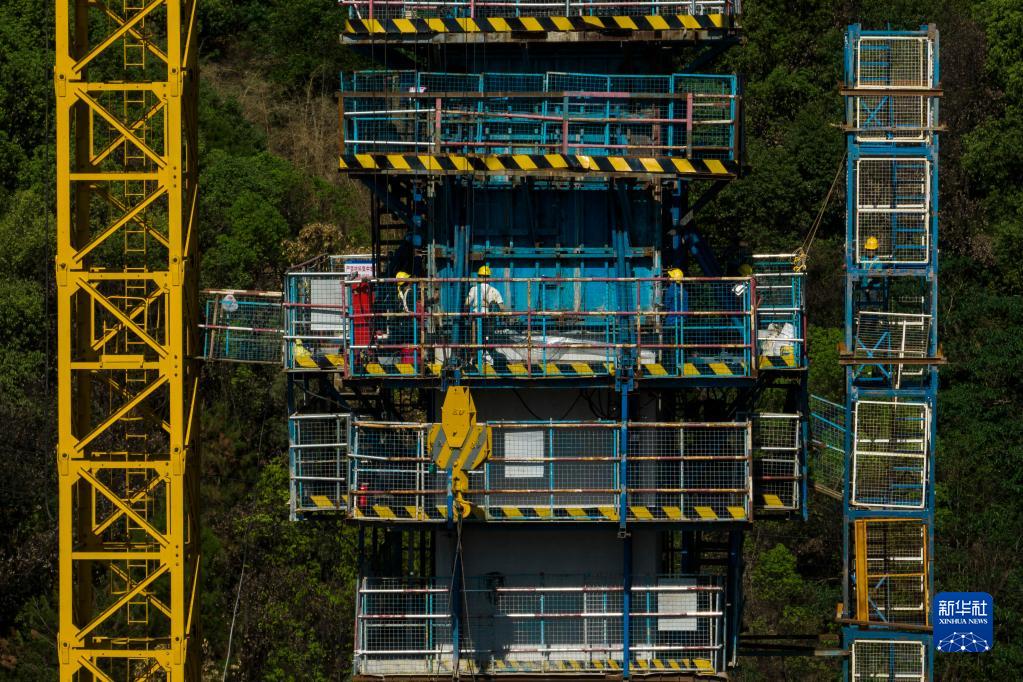 10月3日,中交一公局的工人在重庆市北碚区渝武高速公路复线观音峡嘉陵江特大桥项目现场施工作业(无人机照片)。