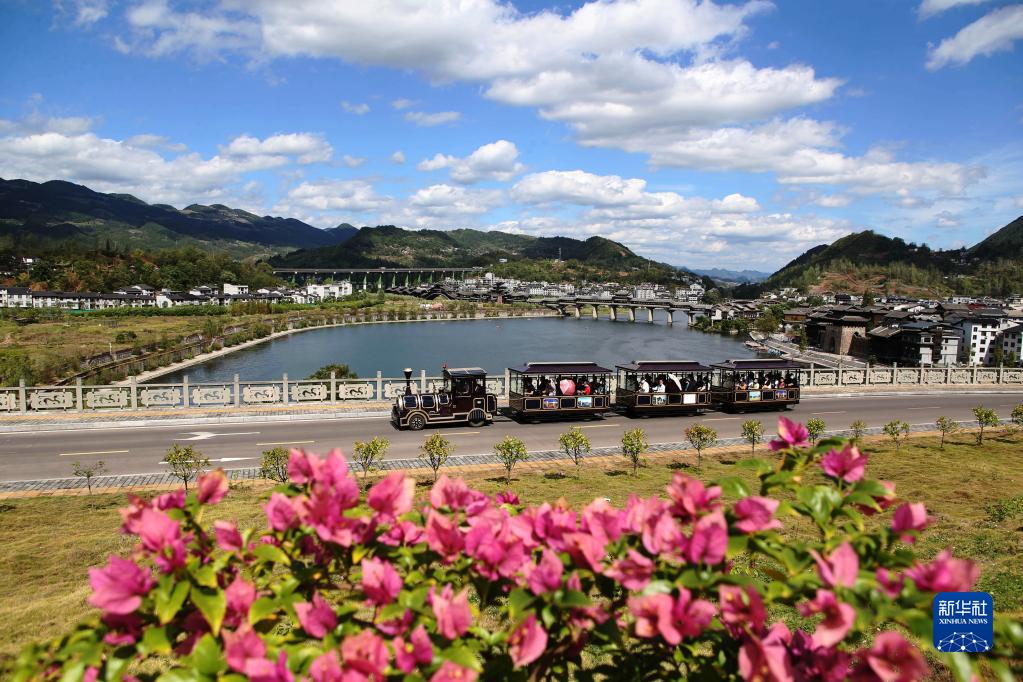 10月3日,游客在重庆市黔江区濯水景区乘坐“小火车”游玩。
