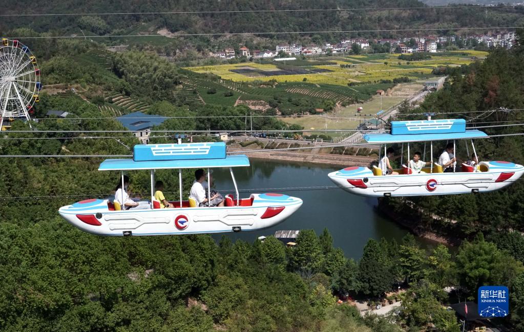 10月3日,游客在浙江省武义县七旗山景区体验“空中飞船”。