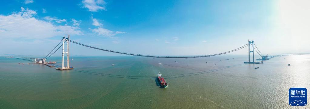 正在建设的珠江入海口深中通道伶仃洋大桥主缆完成架设(2022年9月23日摄,无人机照片)。