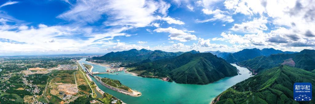 这是建设中的广西大藤峡水利枢纽工程和周边峡谷(2022年8月9日摄,无人机照片)。