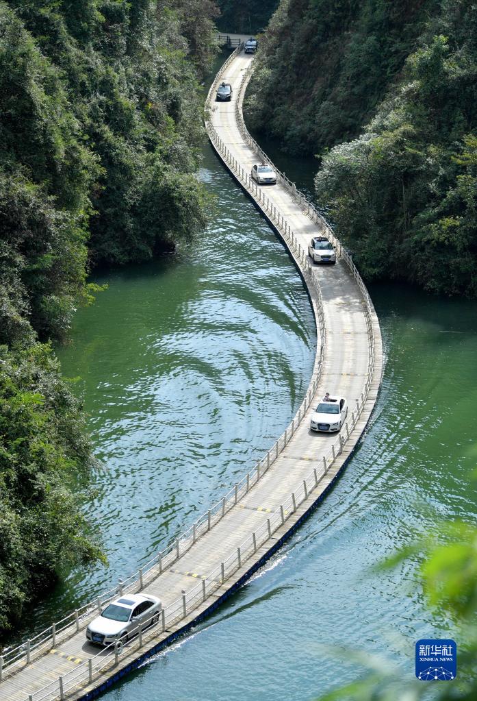 10月4日,游客驾车通过湖北省宣恩县狮子关景区的水上栈道。
