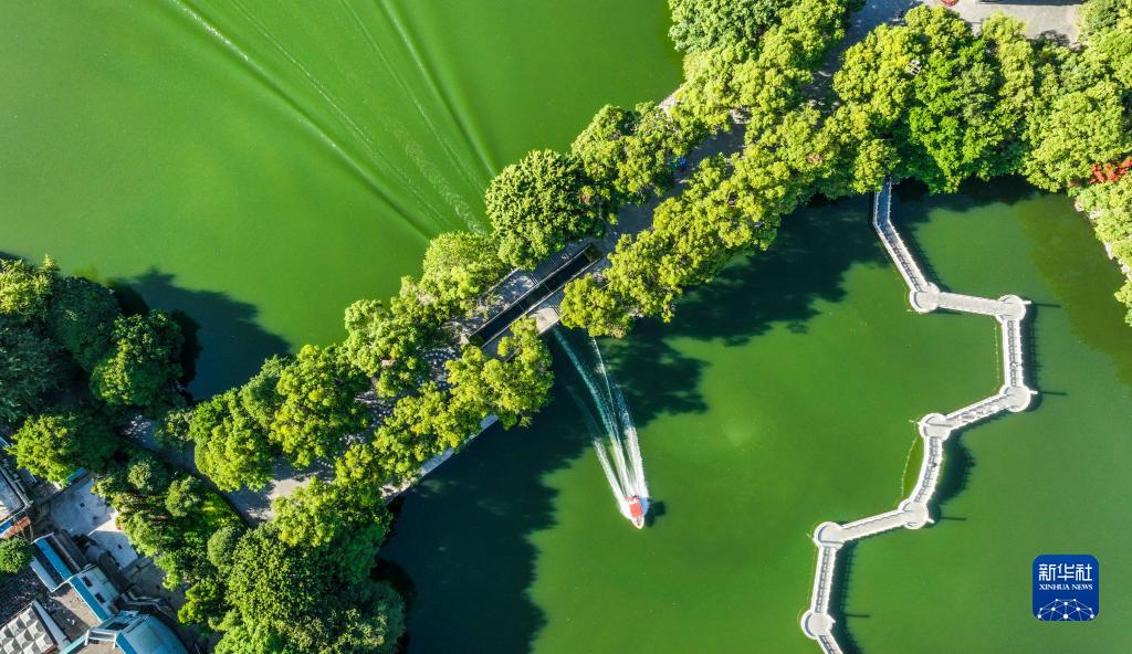 10月3日,游客乘船游览广西桂林市桂湖(无人机照片)。