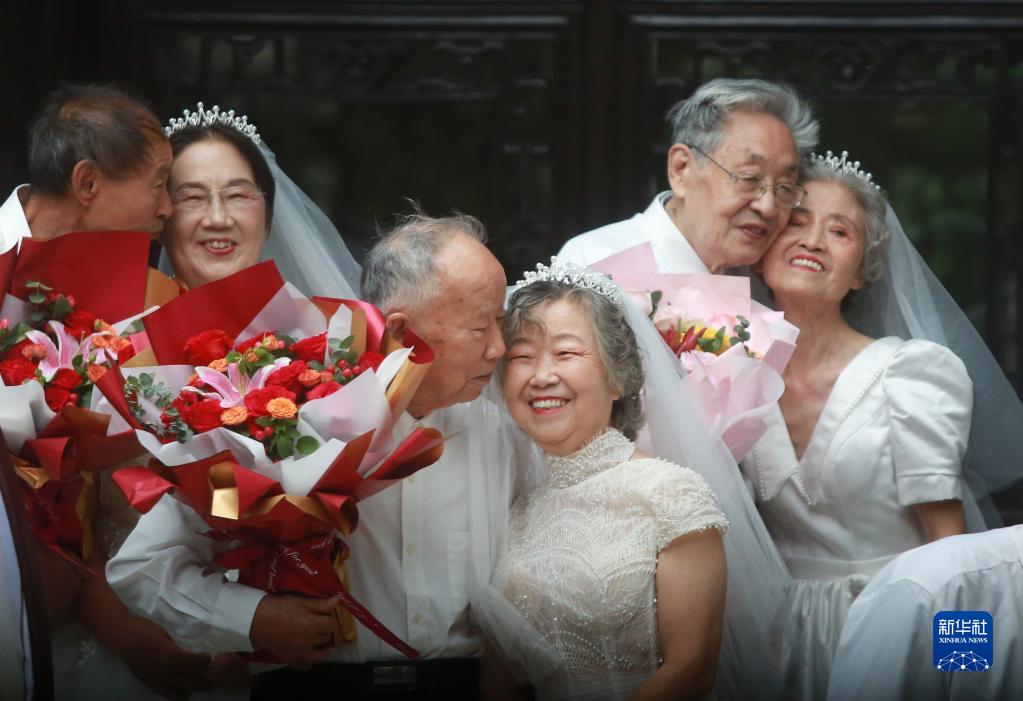 10月4日,金婚老人在江苏省扬州市何园景区参加金婚庆典活动。
