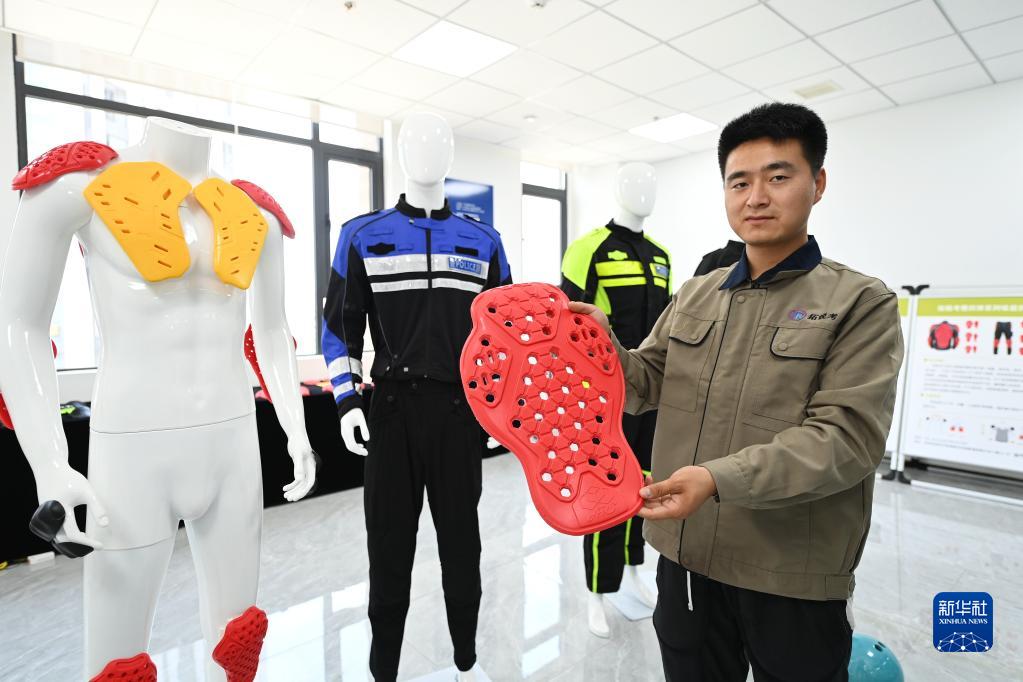 在位于秦创原总窗口所在地陕西省西咸新区的陕西拓锐考新材料科技有限公司,工作人员展示自主研发的纳米智能吸能慢回弹护具(2022年6月17日摄)。新华社记者 李一博 摄