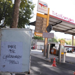 10月4日,在法国巴黎附近的克里希市,一处道达尔加油站前摆出“没有油了,谢谢”的公告牌。