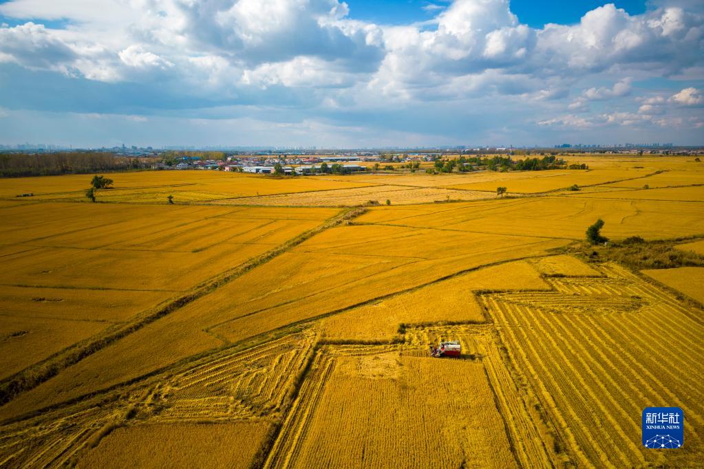 10月5日,在哈尔滨市道外区民主镇,农民在稻田里忙碌(无人机照片)。