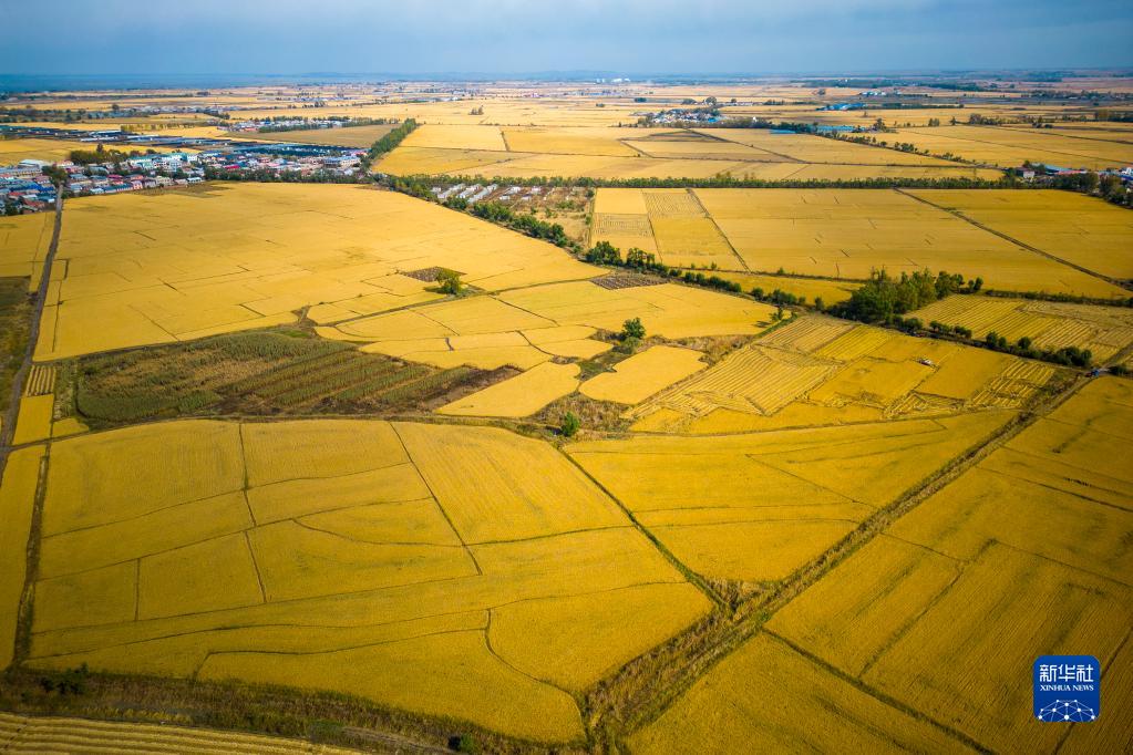 这是10月5日拍摄的哈尔滨市道外区民主镇金黄色稻田(无人机照片)。
