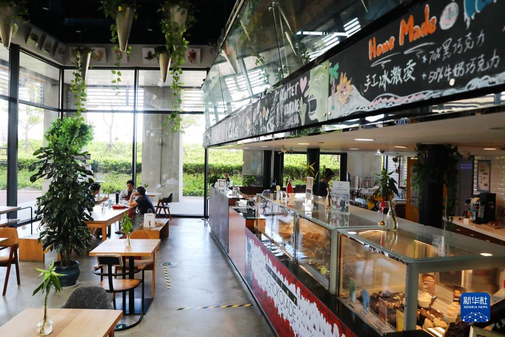 游客们在位于上海杨浦滨江的奥地利珍得巧克力剧院内品尝巧克力食品(2022年9月24日摄)。