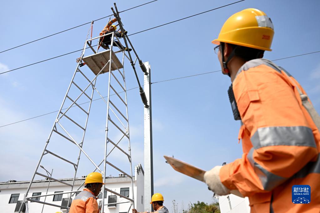 10月4日,在位于安徽黄山的杭昌高速铁路黄山北存车场,接触网工在检修接触网设备。