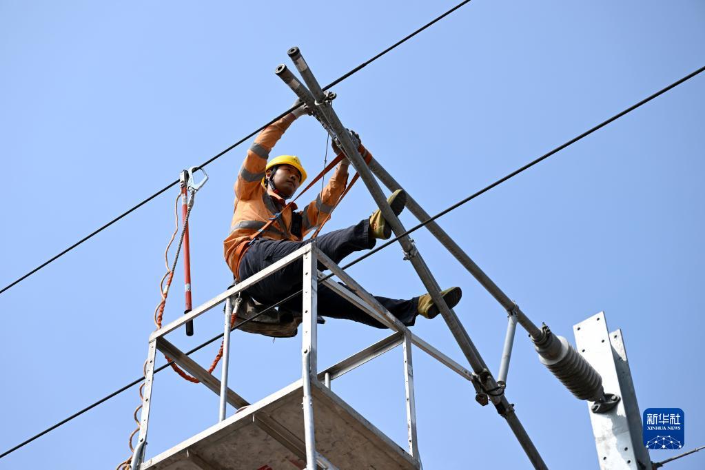 10月4日,在位于安徽黄山的杭昌高速铁路黄山北存车场,接触网工在检修接触网设备。