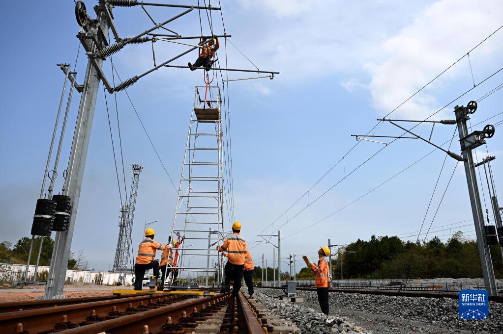 10月4日,在位于安徽黄山的杭昌高速铁路黄山北存车场,接触网工在检修接触网设备。