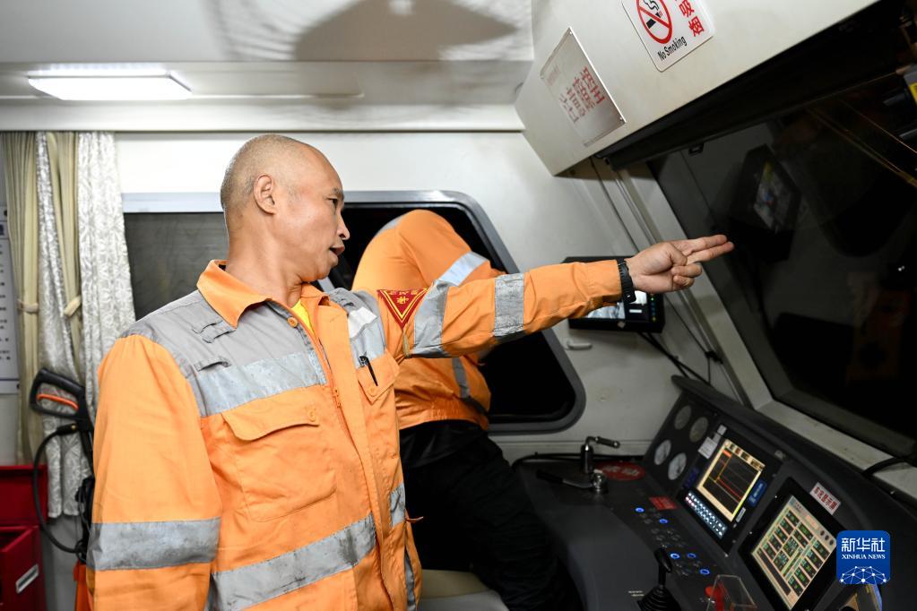 10月4日晚,在安徽宣城,中国铁路上海局集团有限公司南京供电段绩溪北接触网工区接触网检修作业车司机在确认出站信号。