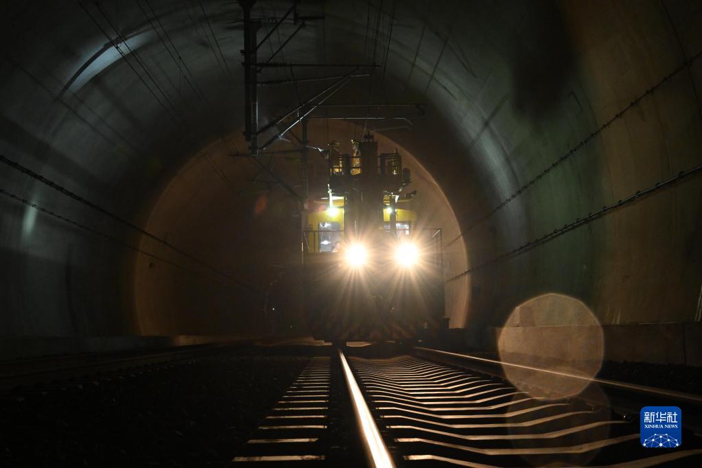 10月5日凌晨,在安徽宣城杭黄高铁绩溪段,接触网工在冲洗接触网绝缘子。