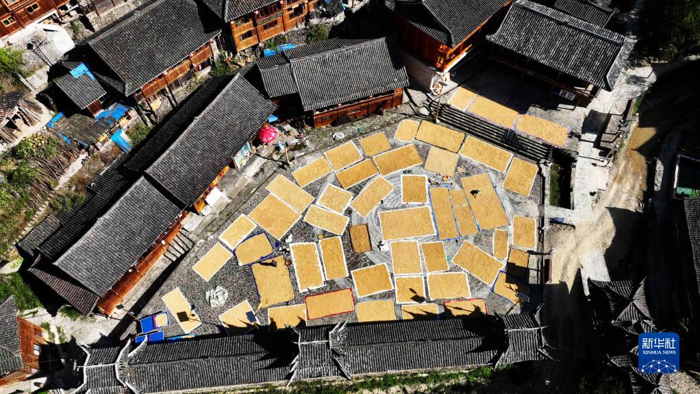 10月5日,贵州省黔东南苗族侗族自治州台江县红阳村村民在晾晒稻谷(无人机照片)。