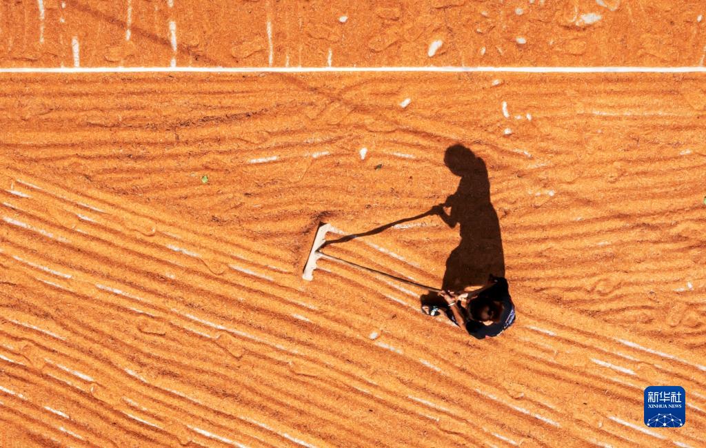 10月5日,村民在贵州省黔西市甘棠镇新田社区晾晒高粱(无人机照片)。