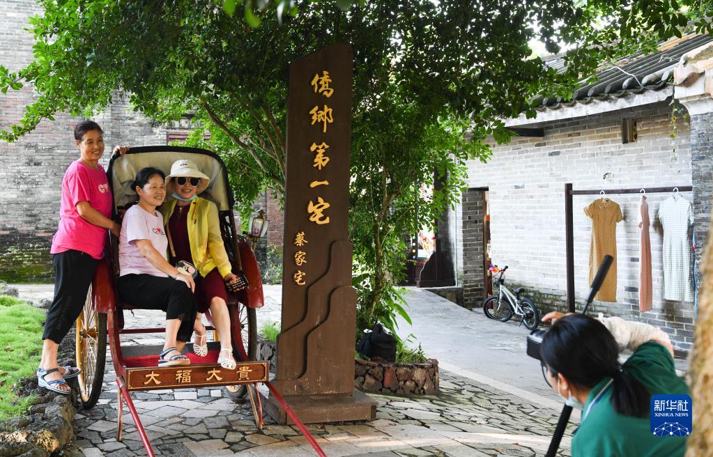 游客在海南省琼海市博鳌镇留客村的蔡家宅内合影留念(2022年10月2日摄)。