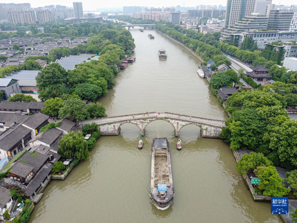行驶在大运河上的货船通过杭州拱宸桥(2022年5月27日摄,无人机照片)。