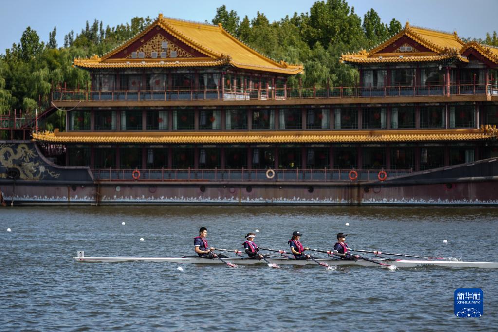 市民在位于北京市通州区的京杭大运河上进行赛艇比赛(2022年9月18日摄)。