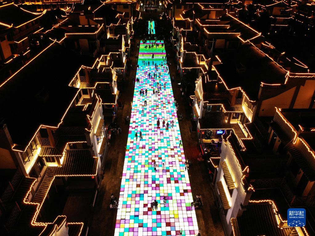 10月5日,云南红河哈尼族彝族自治州蒙自市过桥米线小镇上演灯光秀(无人机照片)。
