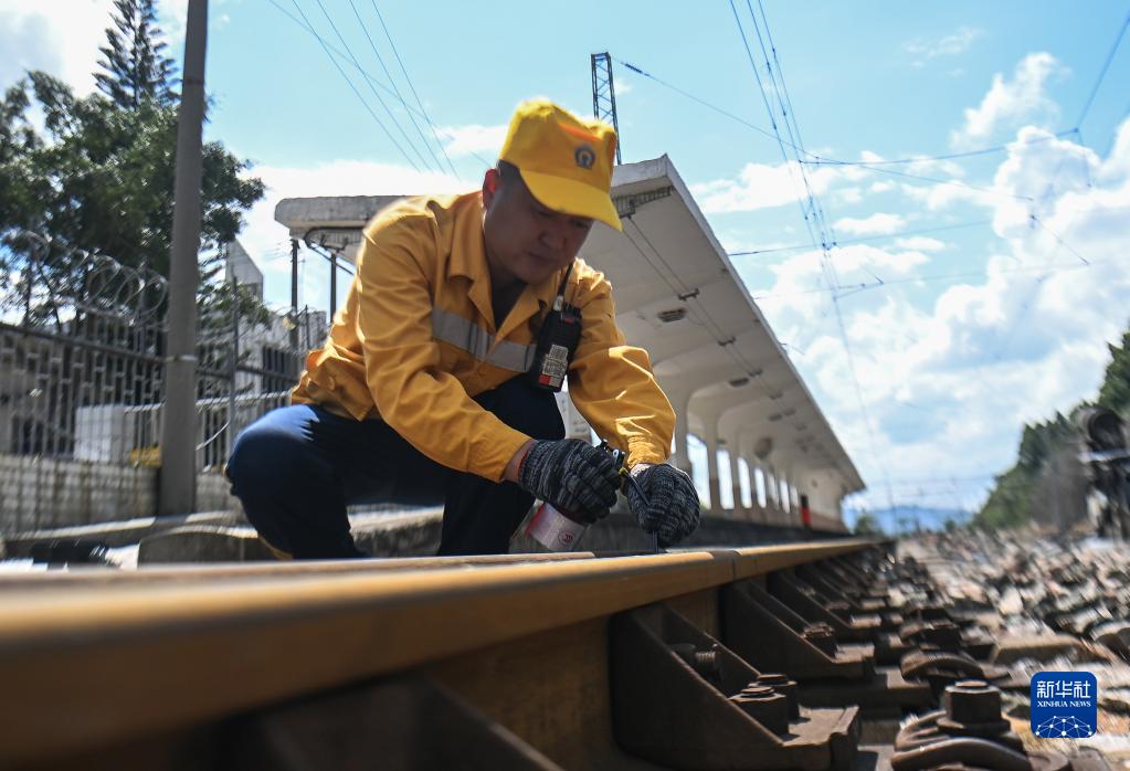 在百色车务段册亨站,张天鹏在清扫道岔并注油(10月5日摄)。