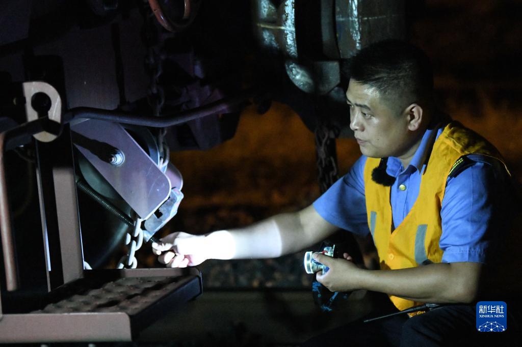 在百色车务段清水河西站,张天鹍在检查列车防溜人力制动机紧固器(10月4日摄)。