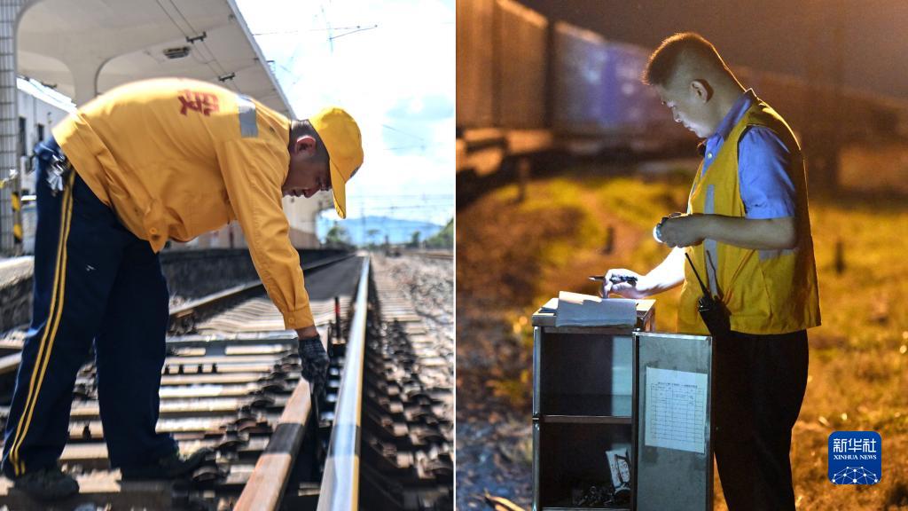 拼版照片:左图为在百色车务段册亨站,张天鹏检查道岔有无破损(10月5日摄);右图为在百色车务段清水河西站,张天鹍检查夜间专用线防溜器具使用情况并签字确认(10月4日摄)。