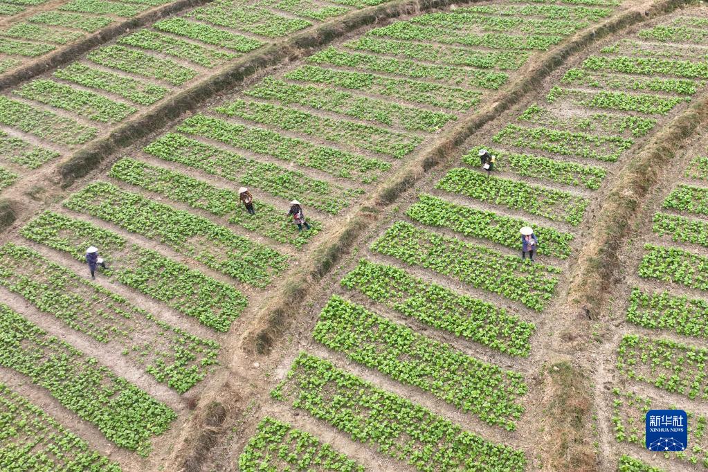 10月6日,村民在贵州省黔东南苗族侗族自治州岑巩县水尾镇大树林村蔬菜基地劳作(无人机照片)。