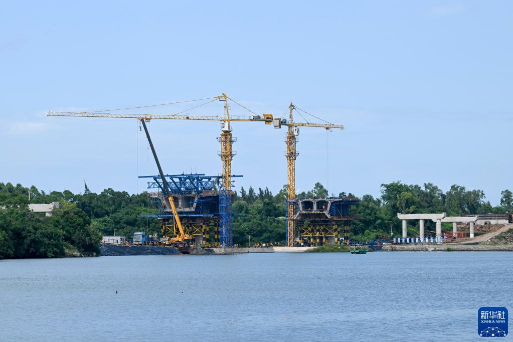 10月6日,工人在海南环岛旅游公路儋州段下浦港大桥工地施工。