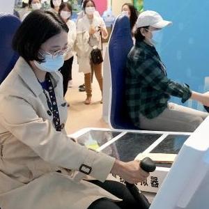 10月7日,观众在“奋进新时代”主题成就展上体验操纵直升机训练模拟器。