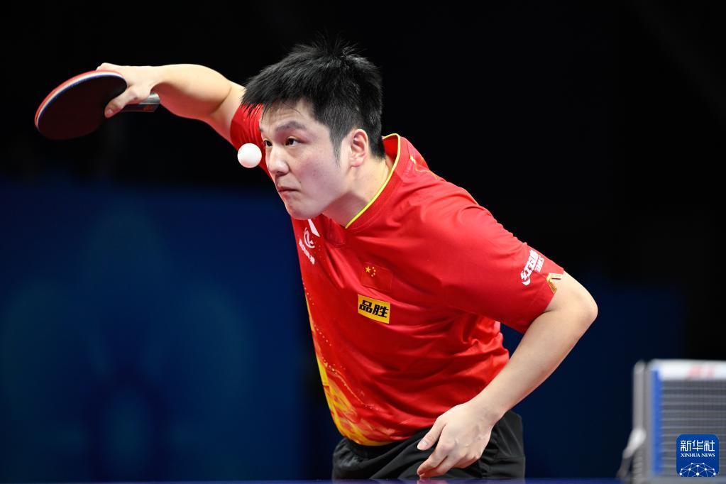 10月8日,中国队选手樊振东在比赛中发球,他以3比0战胜日本队选手户上隼辅。