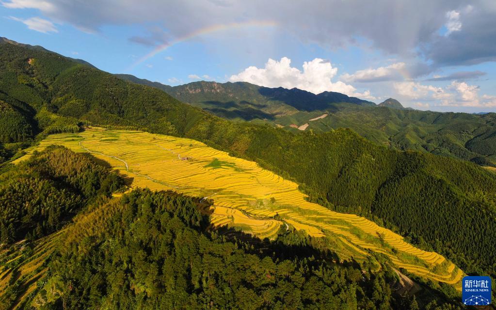 在广东省清远市连山壮族瑶族自治县太保镇欧家村,彩虹与金黄色的欧家梯田相映成趣(10月3日摄,无人机照片)。