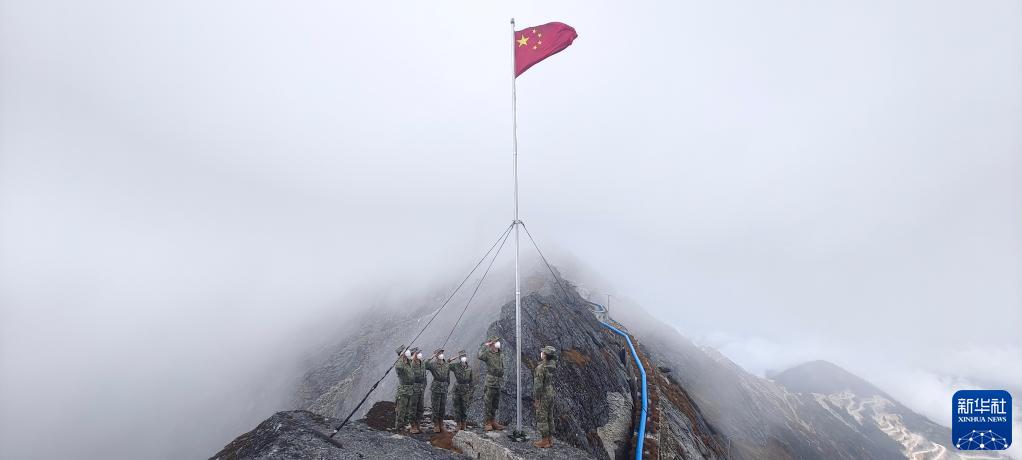 10月1日,西藏亚东海拔4655米的詹娘舍哨所官兵在哨所旁的崖壁上举行升旗仪式。