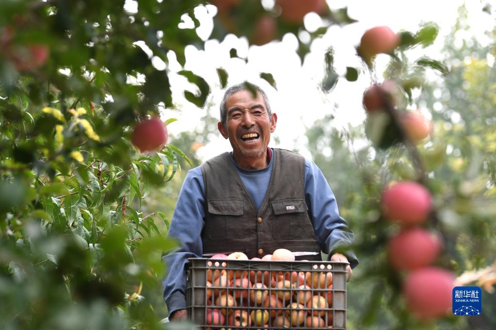 10月8日,农民在河北省张家口市怀来县东八里乡上八里村苹果园里搬运苹果。新华社发(孙慧军 摄)