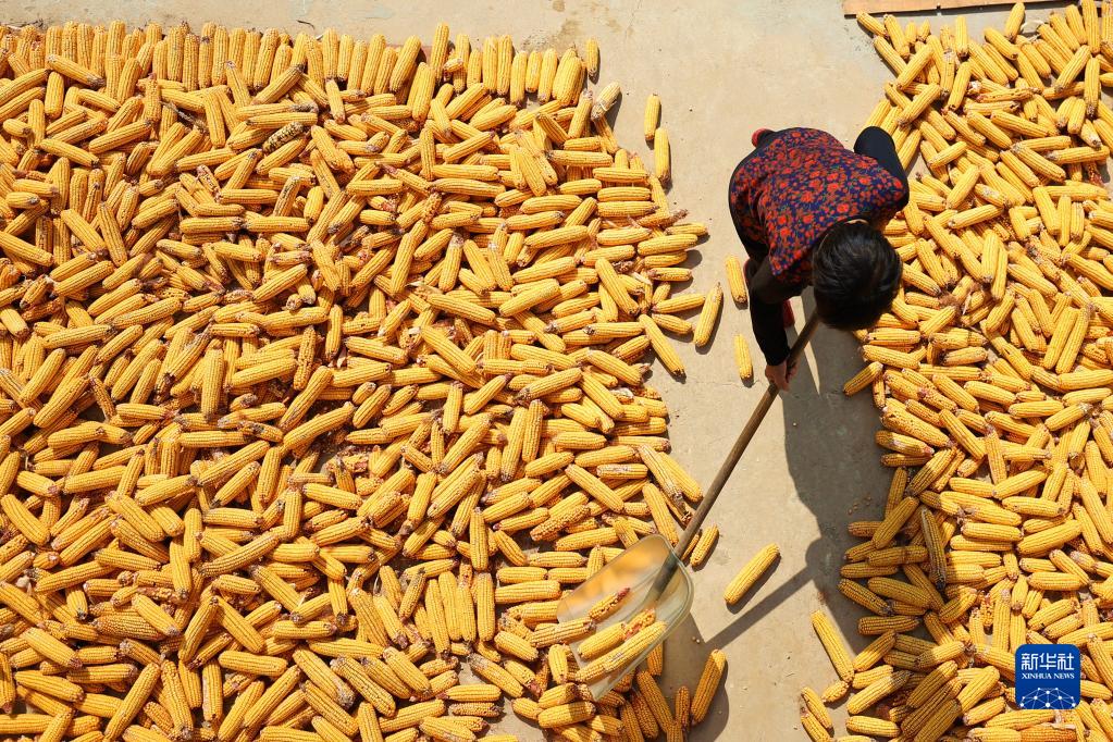 金秋十月,各地农民抢抓农时,晾晒收获的玉米、稻谷等,乡间呈现出金色的丰收图景。