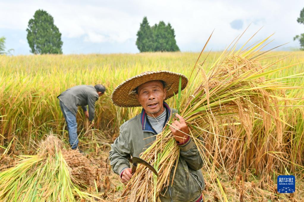 10月9日,在浙江省台州市仙居县朱溪镇杨丰山村,农民在收割稻谷。