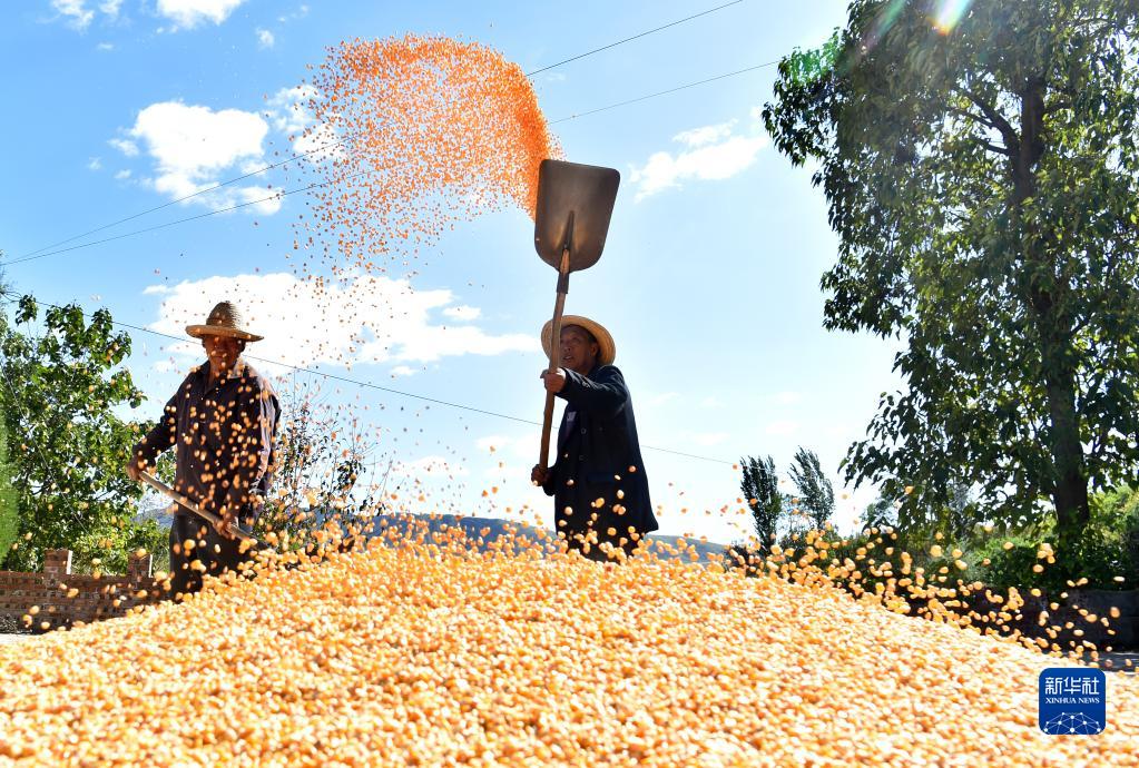 10月9日,河北省石家庄市井陉县小作镇北马峪村农民在晾晒玉米。