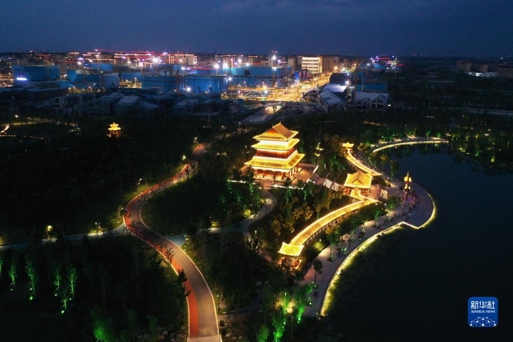 2022年7月28日拍摄的雄安新区容东片区金湖公园夜景(无人机照片)。
