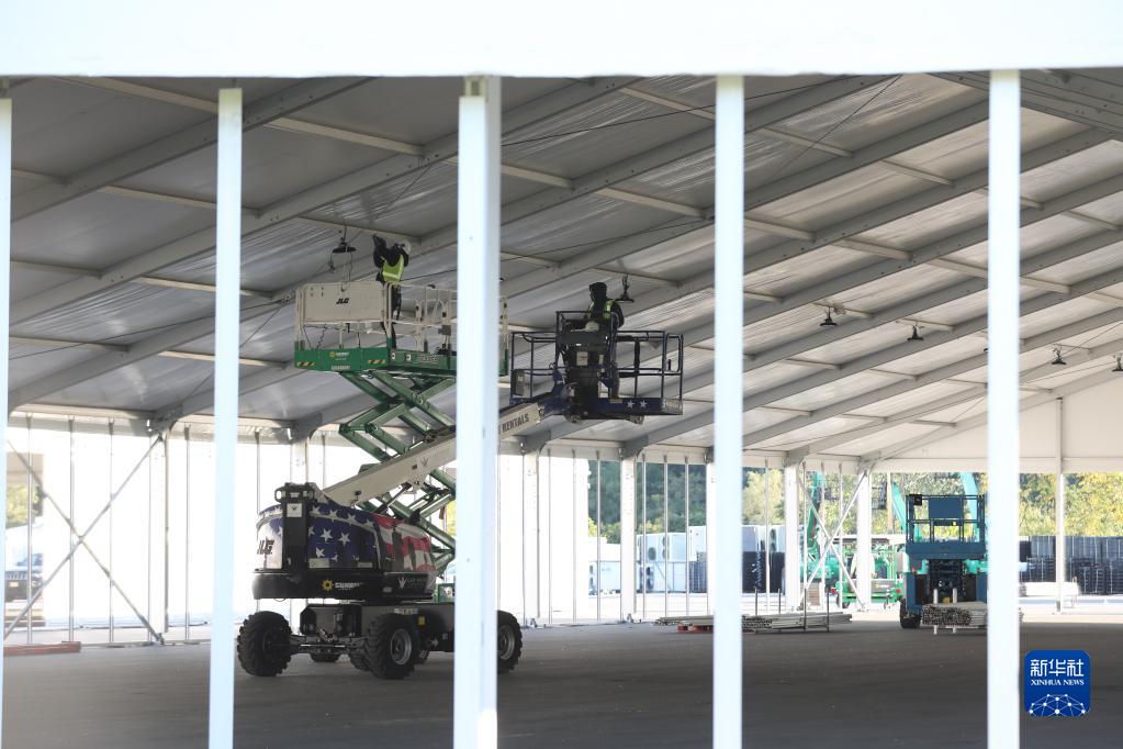 10月9日,工人在位于美国纽约市兰德尔岛的移民救援中心建设工地工作。