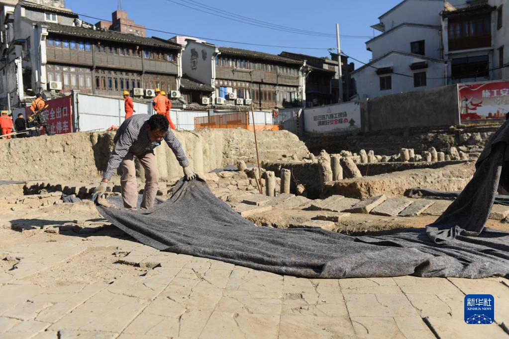 10月10日,考古工作人员在朔门古港遗址覆盖一处古建筑的地基。