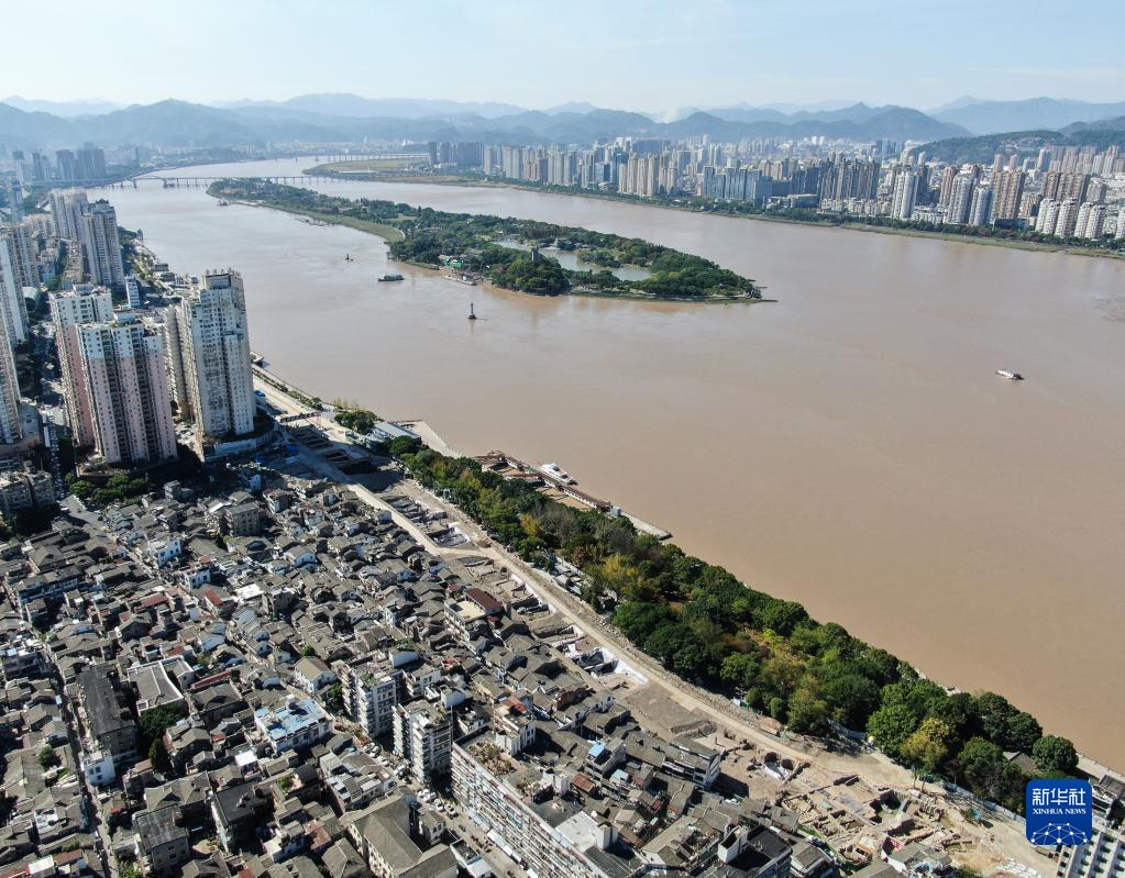 朔门古港考古发掘现场,远处为瓯江上的江心屿(10月10日摄,无人机照片)。