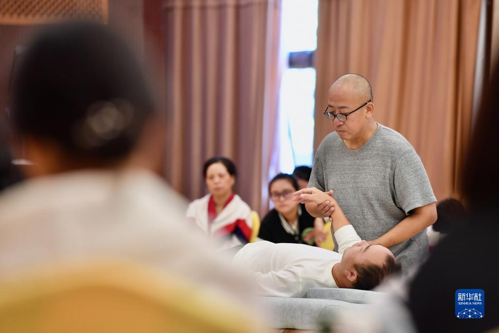 10月11日,在2022年福建省森林康养培训班上,授课老师在教授身体放松手法。