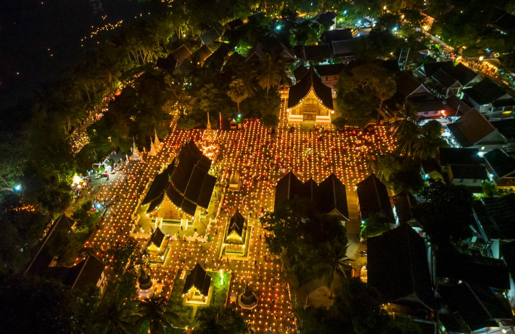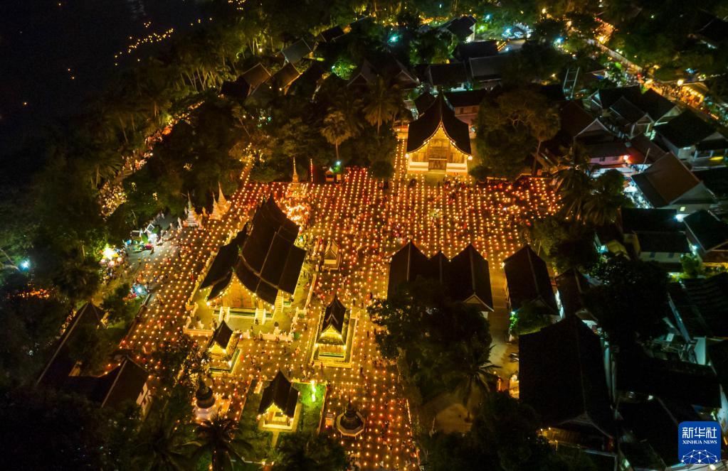 10月11日晚,人们在老挝琅勃拉邦古城点亮花灯(无人机照片)。