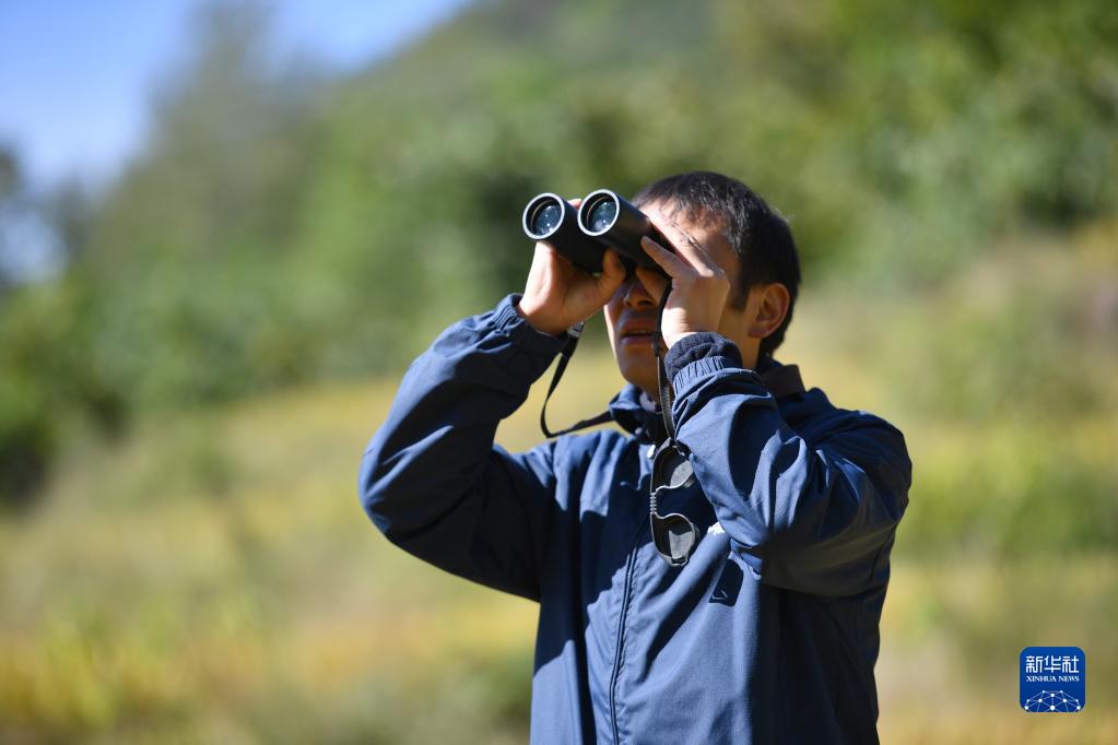 陕西宁陕朱鹮野化放飞基地管理站站长李夏在观察朱鹮的日常状况(10月10日摄)。 新华社记者邵瑞摄