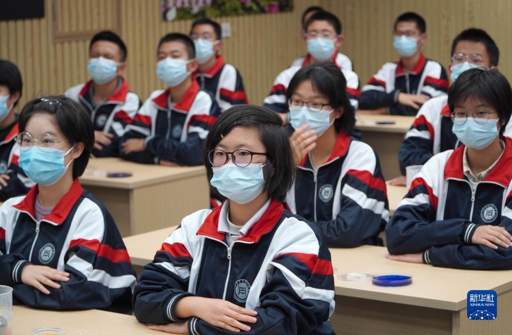10月12日,学生在山东省菏泽第一中学收看“天宫课堂”第三课。 新华社记者 徐速绘 摄