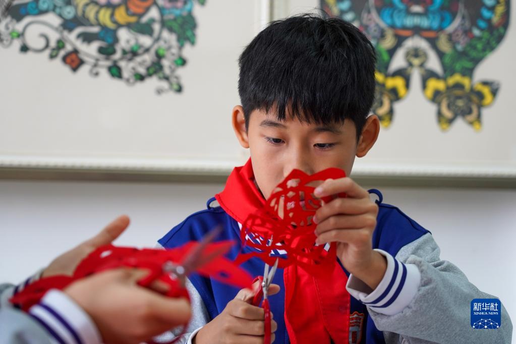 10月13日,张庄小学学生在练习剪纸。