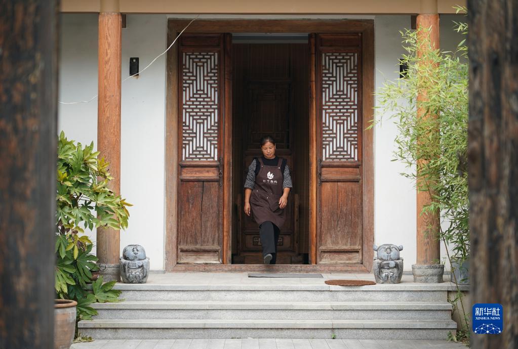 西安市蓝田县小寨镇董岭村村民刘春玲在村里一处民宿内忙碌(2022年9月14日摄)。