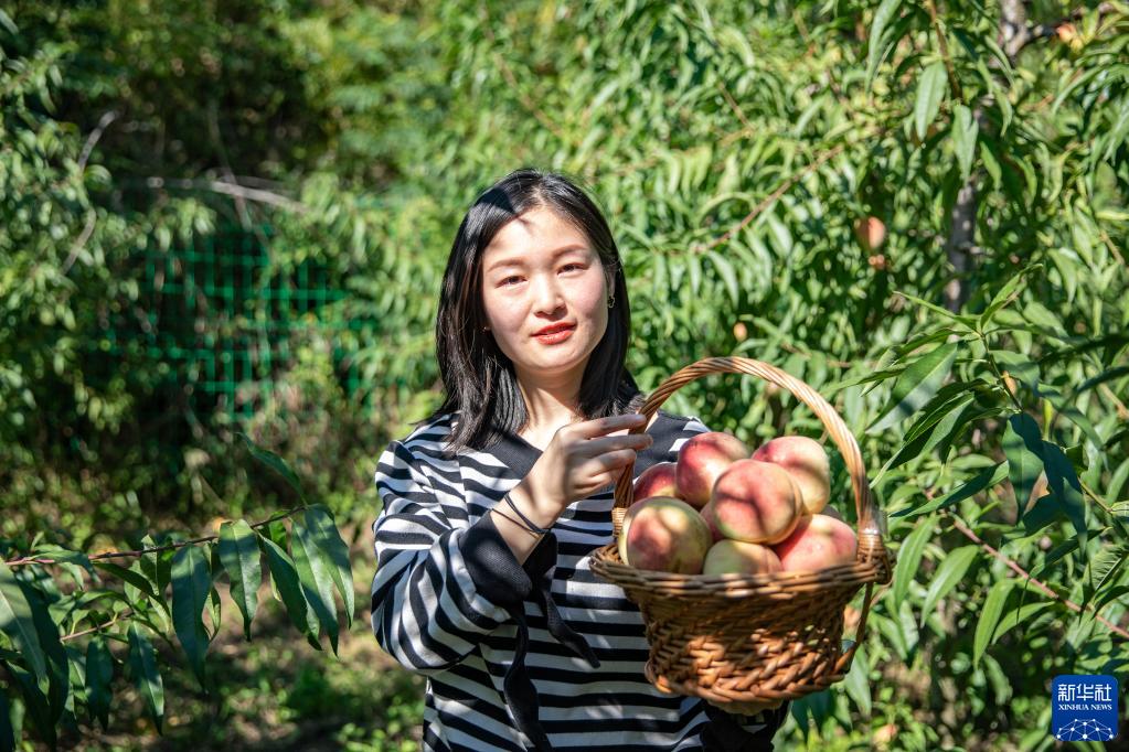 10月13日,在重庆市巫溪县峰灵镇谭家村,一名游客在展示自己采摘的冬桃。